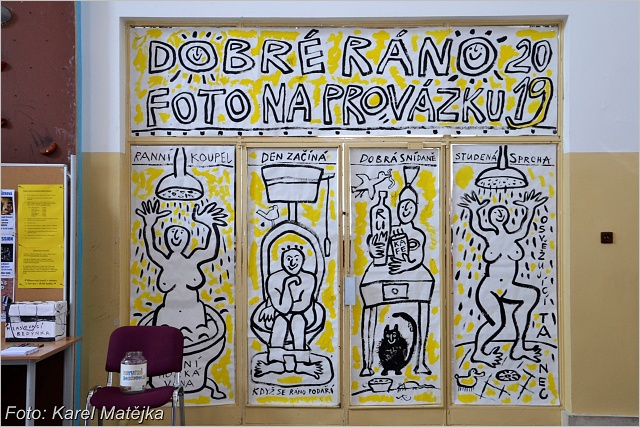 Když jsem přišel v pátek 31. května do prázdného sálu KD, kde se za několik hodin měla začít instalovat fotografická výstava, začala na mne dopadat mírná deprese a obavy, zda to letos zvládnu. Díky Věrce a Rudovi se podařilo postavit stojany, natahat provázky a připravit kolíčky pro zavěšení fotek včas. Nervozita mírně opadla. Pak se začali trousit první fotografové a zvonit telefony. Jak začaly chodit zprávy o tom, kdo z přihlášených fotografů nedorazí a naopak, kdo se nepřihlásil a chce zde vystavovat, začala nervozita opět stoupat. Jolanka Kimlová nám pomohla vyzdobila vchodové dveře tematickým nápisem „Dobré ráno Foto na provázku“. Maky pak pomohla s instalací fotodokumentace z předchozích ročníků a vylepením sponzorských log. Do lednice jsme přichystali občerstvení na vernisáž a okolo desáté večer jsme pověsili poslední fotografie. Dávám si studené pivo z pivovaru, od kterého bych se klidně nechal materiálně sponzorovat a jdu spát.