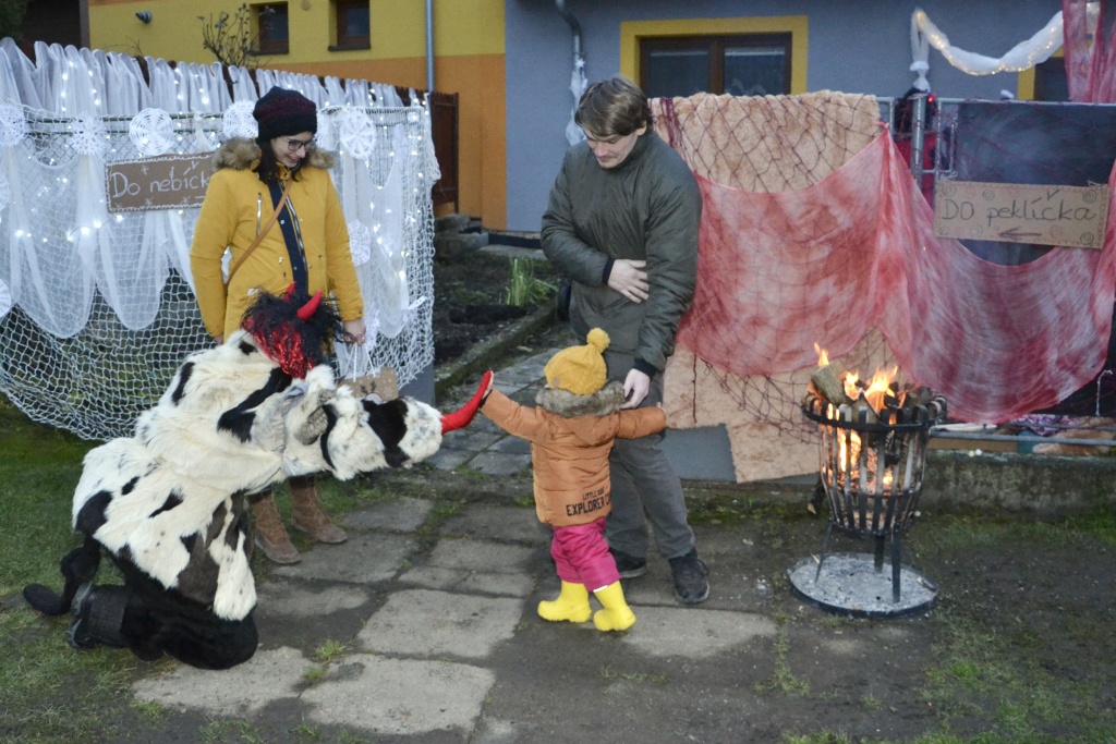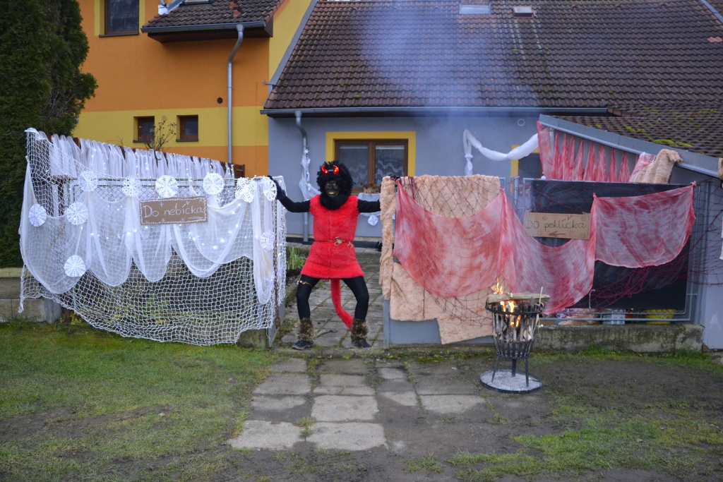 „Do nebíčka“ a „Do peklíčka“ stálo na plotě a k tomu patřičné rekvizity dotvářející tu správnou „mikulášskou“ náladu. Nechyběli samozřejmě andělé, čerti a Mikuláš. A kde že to bylo? No přece ve Strunkovicích na dvoře domku u Ivety Kosmatové a Bohumila Kříže. Sem také dorazilo více jak 50 rodin s dětmi, aby si odnesly nějaký ten mikulášský dárek. Tomu ovšem předcházelo čtení z Pekelné knihy hříchů, dětské sliby, slzičky, básničky…Vše nakonec dobře dopadlo. A za to patří velký dík všem, kteří se podíleli na přípravě celé téhle akce. Ivetě a Bohoušovi za poskytnutí azylu. Čertům za řinčení řetězy a čtení dětských prohřešků. Andělům za vlídná slova a krocení čertovské chásky. Mikulášovi za nebeské pohlazení a víru v to, že se všichni polepšíme. Rodičům za to, že s dětmi přišli, protože bez nich by to jaksi nebylo ono.