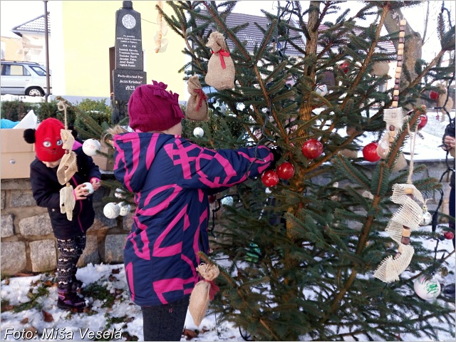 Naše šipounské děti myslely na toto tvoření již celý podzim a sbíraly a sušily plody přírody. Nyní jsme je mohly využít pro vánoční dekorace na náš osadní stromek, který stojí před kapličkou na návsi. Všechny ozdoby jsou na něm vyráběné vlastnoručně a neobyčejně nás těší ho zdobit. Jsme rádi, že nám ukazuje na kouzlo Vánoc a připomíná nám, že už nastává čas radosti, veselosti.