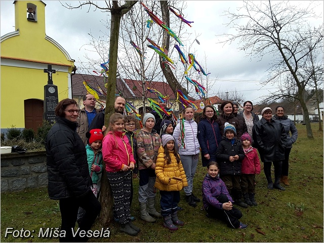 V 16 hodin jsme se vydali ke kapličce a ozdobili naší první břízku, kterou nám zajistil pan Jílek. Dospělí nám s tím pomohli a pak nastalo veliké focení. Nakonec nás ještě pan Špiroch pošťouchnul, abychom hlavně nezapomněli obejít ves s řehtačkama. Jenže, kde je vzít? Protentokrát nám postačily pokličky, ale příští rok už máme plány jiné, až uletí zvony do Říma, tak budeme řehtat a u toho se taky budeme řehtat.