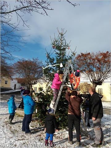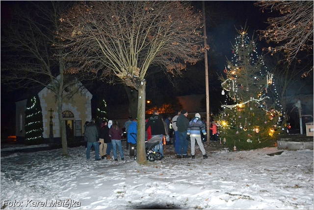 Poté se všichni přesunuli na náves před kapličku, kde byl slavnostně rozsvícen vánoční strom plný ozdob, které si připravili děti a jejich rodiče. Nechybělo ani občerstvení, a tak se kolem rozzářeného stromku ještě dlouho jedlo, pilo a diskutovalo.