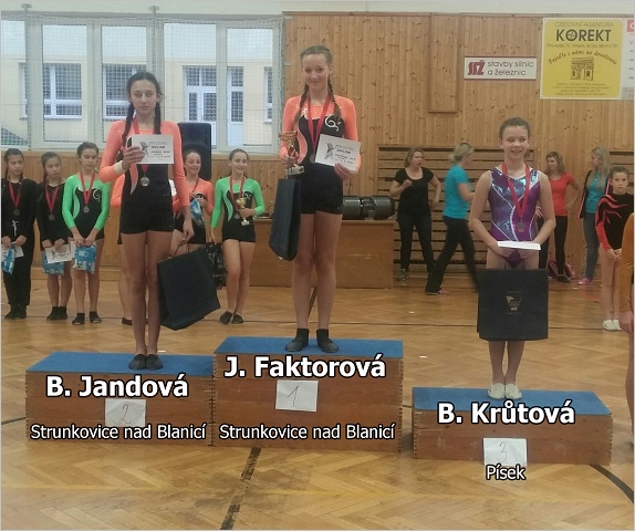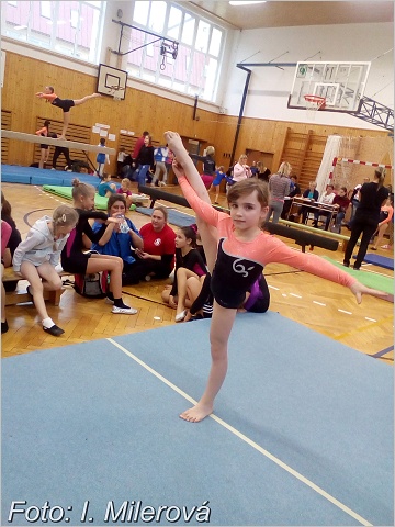 Závodní kategorie byly rozděleny opět jako každý rok podle věku a výkonnosti cvičenců. Děti z mateřské školky a 1. tř. závodily pouze ve dvojboji – akrobacie a přeskok. Ostatní v gymnastickém trojboji – akrobacie, přeskok a lavička / kladina (chlapci kruhy). Všichni se v průběhu závodu snažili podávat co nejlepší výkony. Závodnice i závodníci si vyzkoušeli akrobacii na palubové podlaze, kterou mají ve Vimperku novou. Občas se něco nepovedlo, ale skvělá atmosféra, fandění rodičů, podpora kamarádů a potlesk diváků vše vynahradilo. Slavnostní vyhlášení výsledků proběhlo na třikrát (MŠ až 4. tř. dříve) vzhledem k velkému počtu malých gymnastek, pro které by bylo čekání na konec celého závodu velice dlouhé. Každý soutěžící obdržel diplom, věcnou cenu a pamětní medaili. Vítězové získali navíc krásné poháry. Do Strunkovic putovalo 7 pohárů za první místo. Všem našim zúčastněným děkuji za skvělou reprezentaci. Některá děvčata na sobě velmi pracovala a do soutěže nacvičila náročné prvky. Chtěla bych vyzdvihnout výkon Julie Faktorové, která jako jediná v celé soutěži předvedla na kladině pomalý přemet vzad, ale i výkon Anety Pechové, Niny Švrčkové, Anežky Podlešákové, Anety Valentové, Báry Jandové a Dominika Milera na akrobacii. Rodičům děkuji za podporu svých dětí a za pomoc s dopravou na závody.